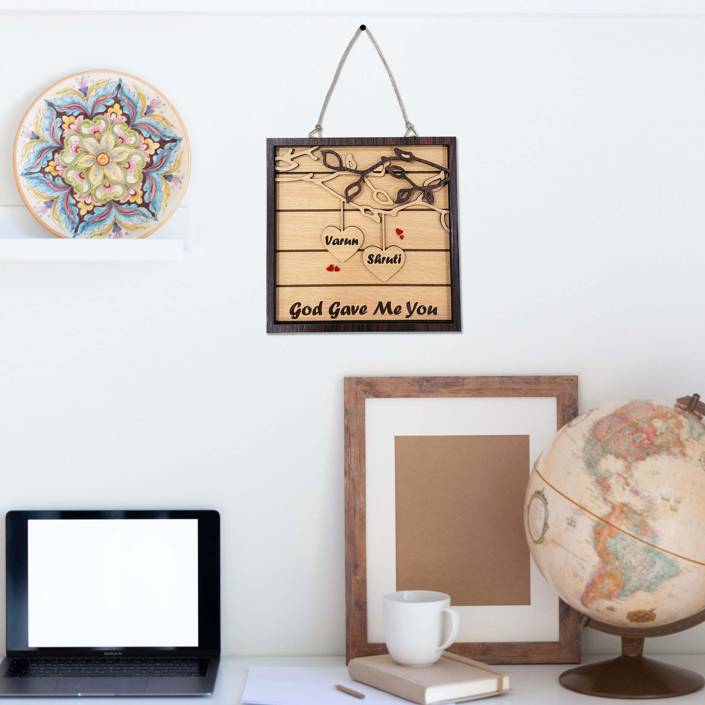 This custom couple name sign frame features a branch design with a message on the front that says, “GOD GAVE ME YOU”. This wall hanging love birds sign is perfect for wedding, anniversary, Valentine Day and everyday use.
