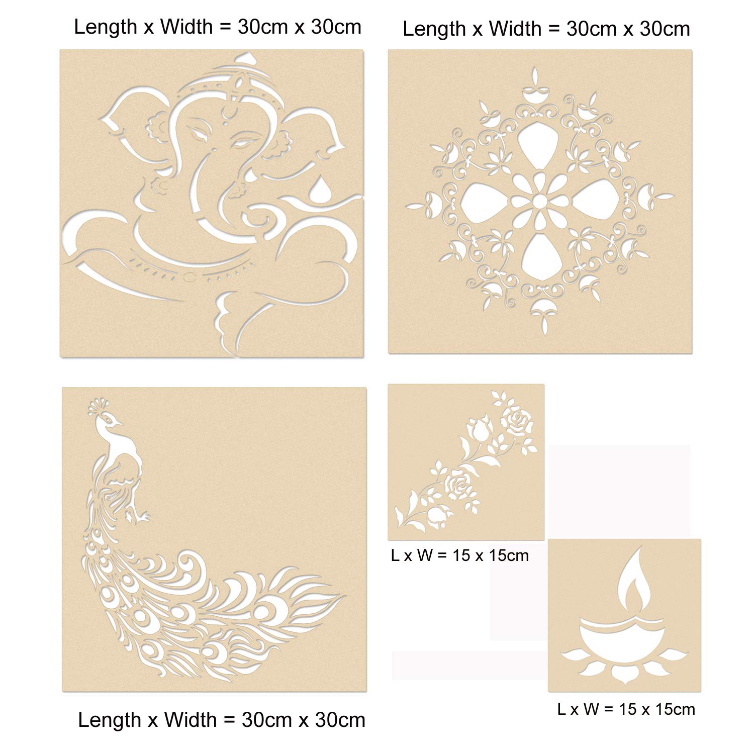 - Size: Set of 5 Rangoli Stencils with 3 Stencils of 30cmx30cm and 2 Stencil is of 15cmx15cm with colours