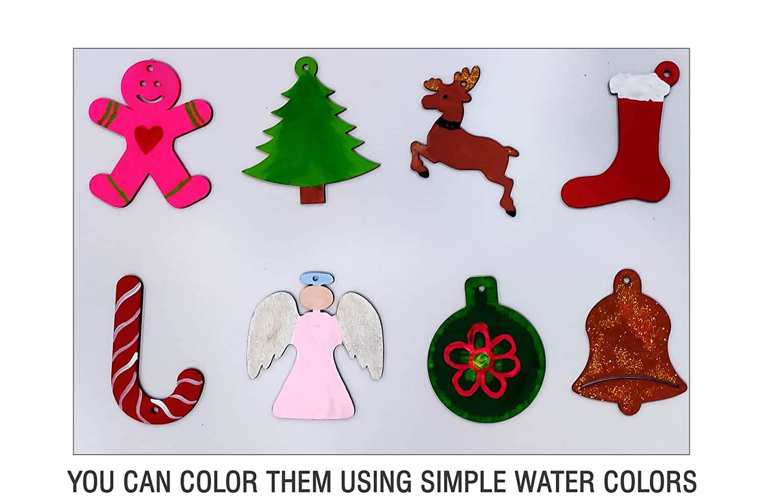 Set of 8 Christmas Decorations Ornaments, DIY Color, Thread Included, Wooden Christmas Tree Ornaments, Kids will enjoy by colouring and decorating