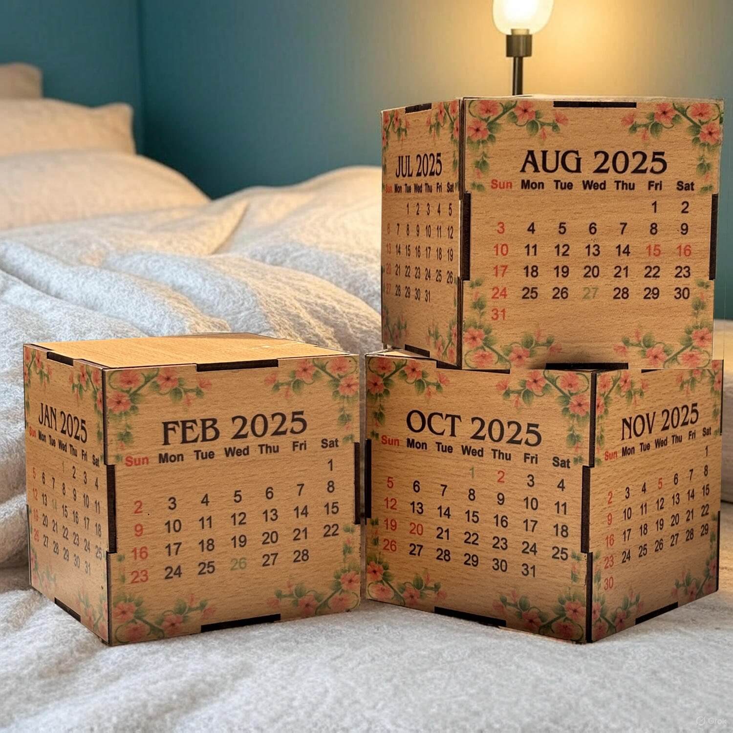 Stay organized in style with this beautifully crafted Wooden Calendar Box Set. Designed using durable MDF wood and adorned with delicate floral patterns, each cube represents four months of the year 2025. With a total of 3 interlocking boxes, you get a compact, stackable, and eye-catching desk accessory that brings both functionality and elegance.