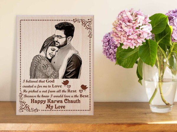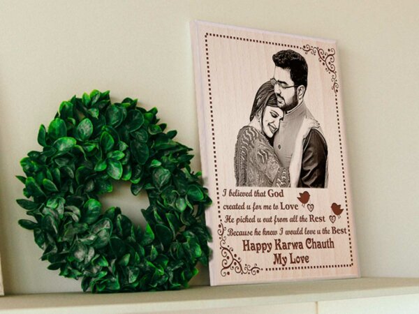 Karwachauth is a special day for every married women in India and husband or friends look for something unique to present on this special day. Incredible Gifts created some unique gifts or ladies gift items that can be presented to wife, sister in laws, mother in law or her. This product is made of natural beech wood and the engraving is done in very fine way. You can touch and feel the depth of the photo and text message on wood. The engraving is for life and it will never fade. You can clean it using wet cloth. It can be used as table top and largest size 12×9 can also be used as wall hanging frame. Present it as a gift for wife special. Karwachauth gift for wife, karwachauth gift for mother in law, karwachauth gift for sister in law, karwachauth gift set or pack or ladies gifts.