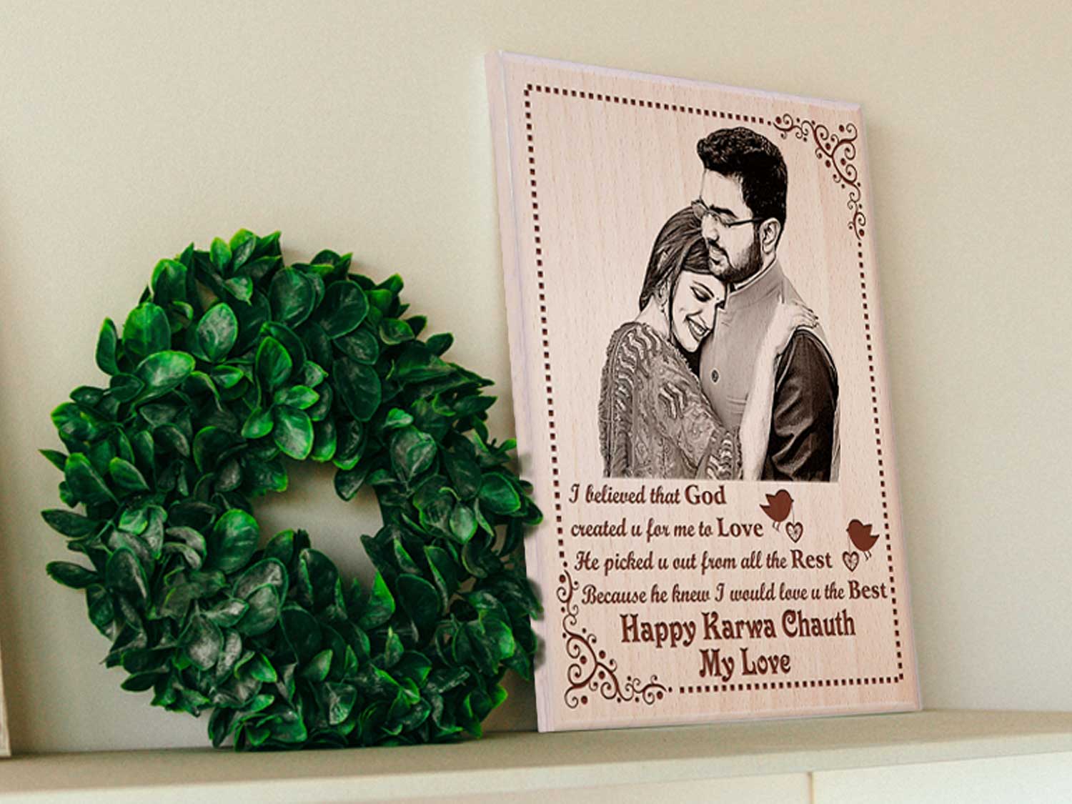 Karwachauth is a special day for every married women in India and husband or friends look for something unique to present on this special day. Incredible Gifts created some unique gifts or ladies gift items that can be presented to wife, sister in laws, mother in law or her. This product is made of natural beech wood and the engraving is done in very fine way. You can touch and feel the depth of the photo and text message on wood. The engraving is for life and it will never fade. You can clean it using wet cloth. It can be used as table top and largest size 12×9 can also be used as wall hanging frame. Present it as a gift for wife special. Karwachauth gift for wife, karwachauth gift for mother in law, karwachauth gift for sister in law, karwachauth gift set or pack or ladies gifts.