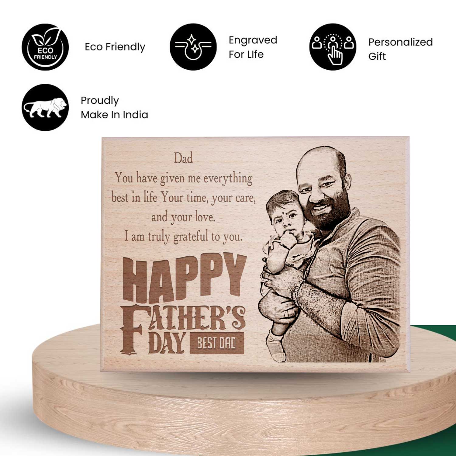 What sets our Engraved Wooden Photo Frame apart is the customization feature. Engraved with intricate details, this father’s day photo frame becomes a truly one-of-a-kind gift. Our engraved photo frame isn’t just a gift; it’s a symbol of the bond between father and child. Every time Dad gazes upon the frame, he’ll be reminded of the love and appreciation that surrounds him. Our personalized gifts for dad are tangible expression of gratitude that speaks volumes without saying a word. In a world filled with fleeting trends, our wooden engraved gifts stands the test of time.