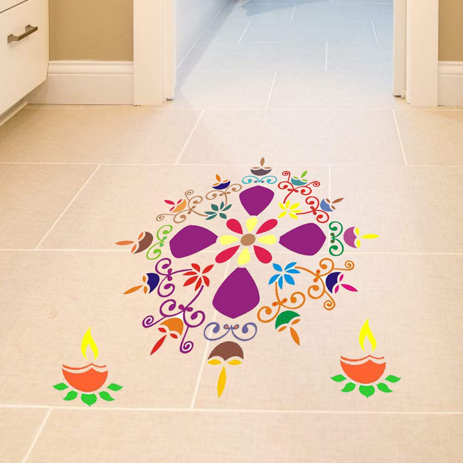 Floral Diya Rangoli Stencils for Diwali Decorations (Set of 2 Stencil, 6 Colors Bottles, 1 Nozzle)