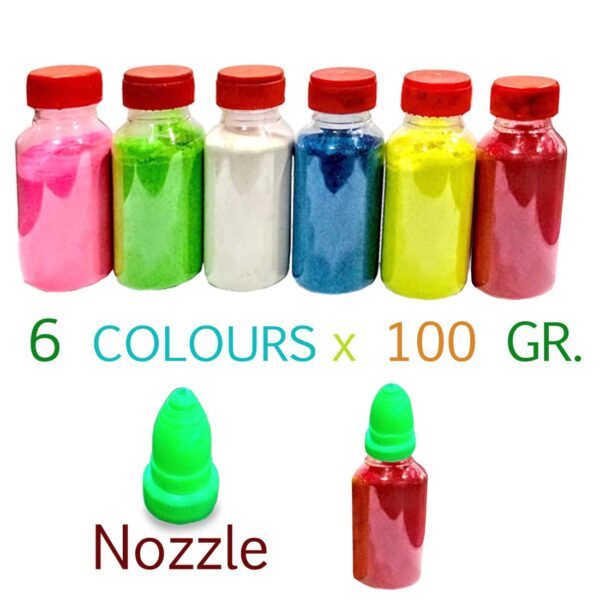 - Rangoli Kit Includes Rangoli Bottles with nozzle that can be put on any color bottle.