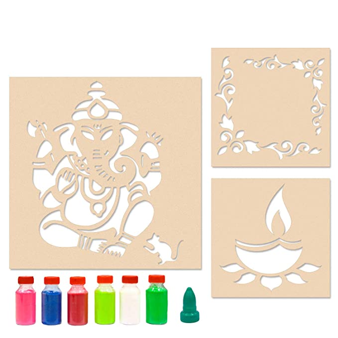 Ganesha Diya Rangoli Stencils for Diwali Decoration (Set of 2 Stencil, 6 Colors Bottles, 1 Nozzle)