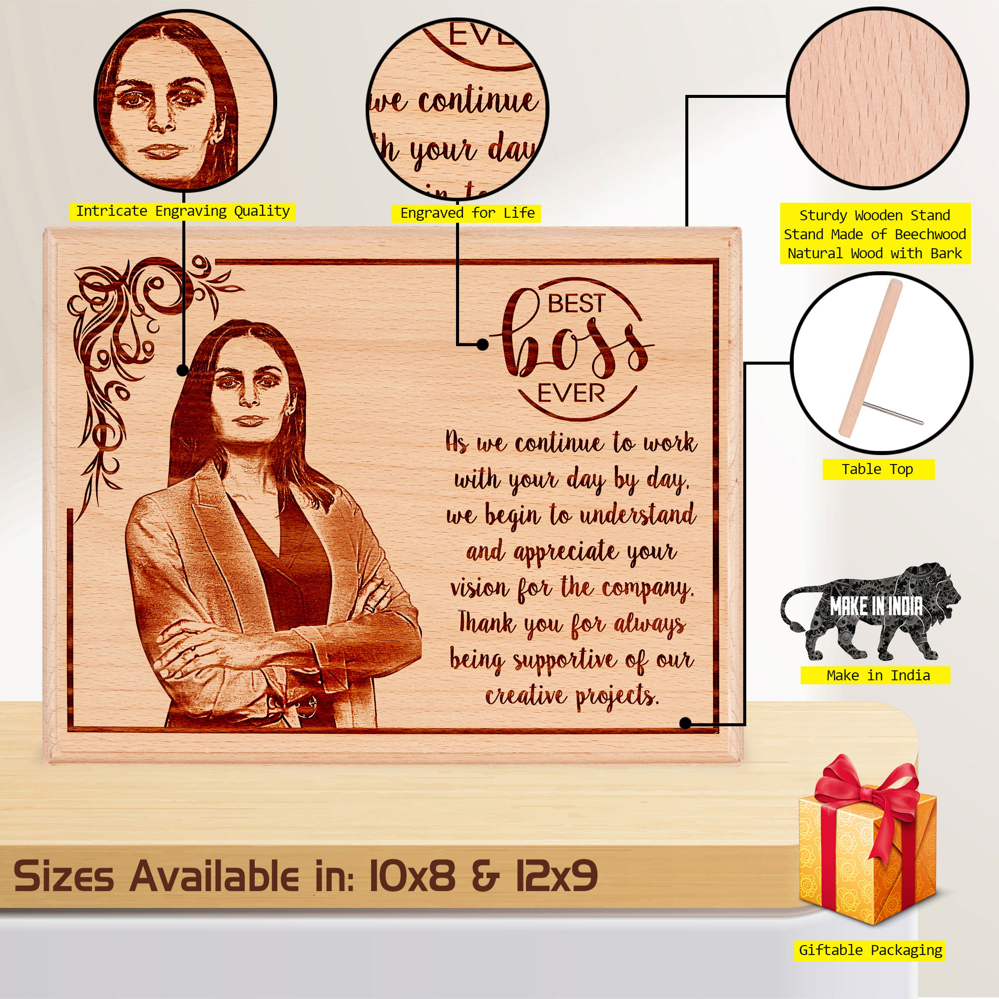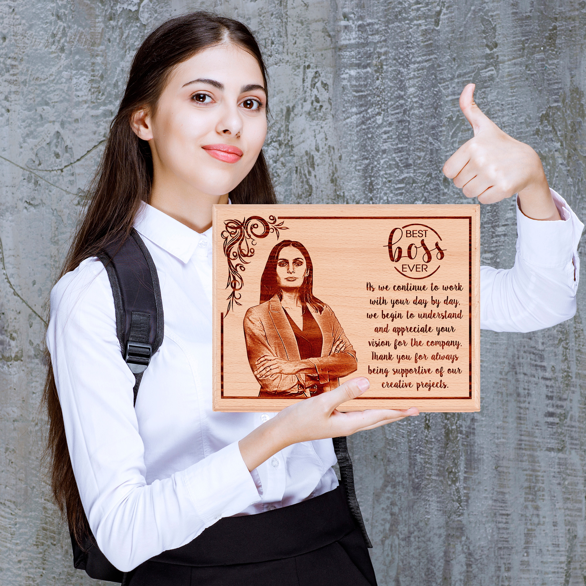 Great gift for colleague or manager or boss. This wooden frame is made of beechwood, the User can upload photo and text, that will be engraved on wood and will stay for life. Engraved intricately and comes in large size that can be hung on wall or as a table top.
