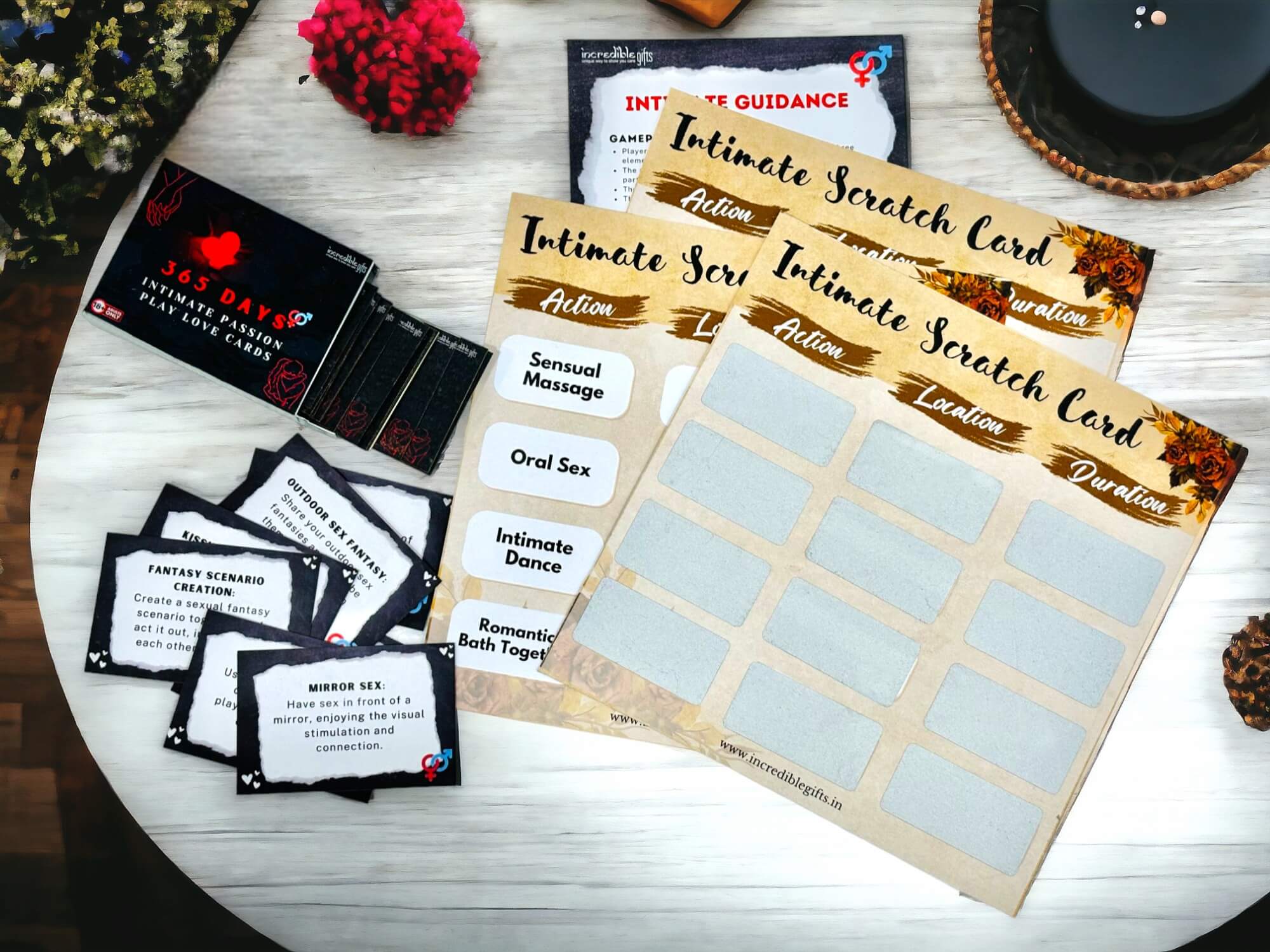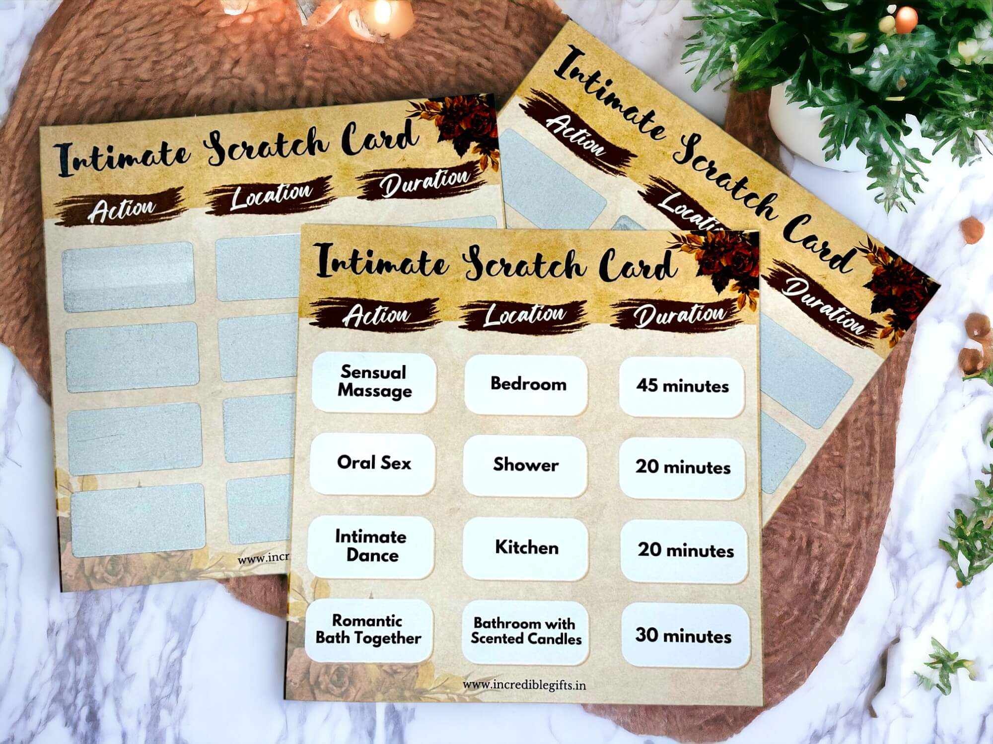 Designed for couples seeking to enhance their connection and intimacy, each scratch card reveals a unique combination of action, location, and duration, allowing you to create personalized and unforgettable experiences with your partner. Simply scratch the card to unveil the action you and your partner will embark upon, the location where the scenario will unfold, and the duration of your romantic adventure.