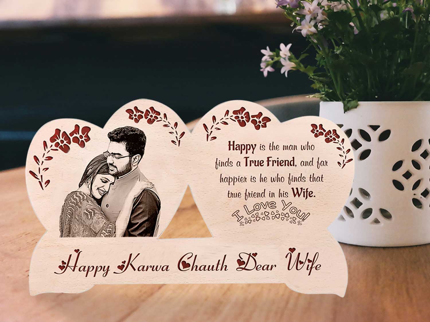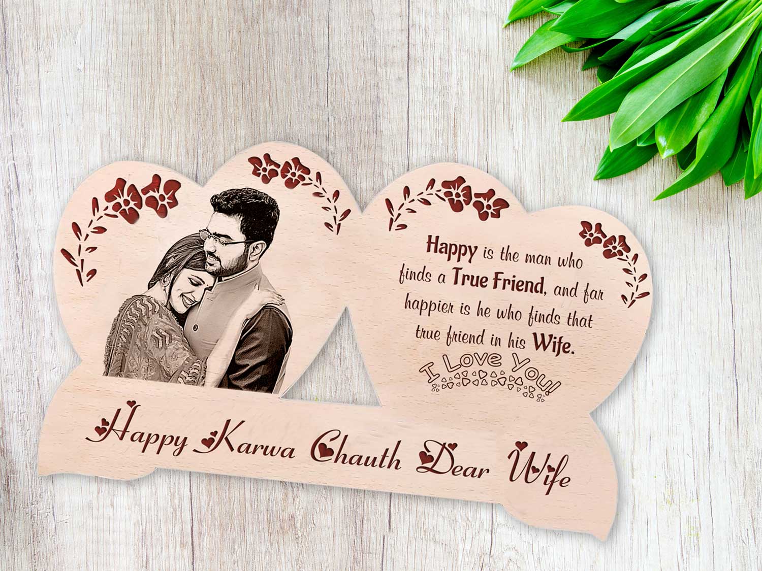Karwachauth Engraved Wooden Photo Frame Gift for Sweetheart Wife