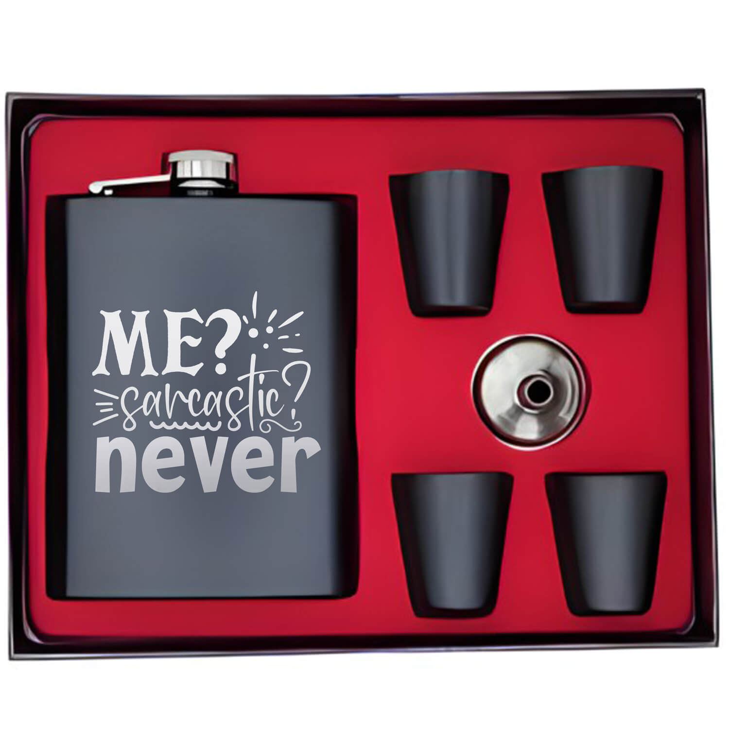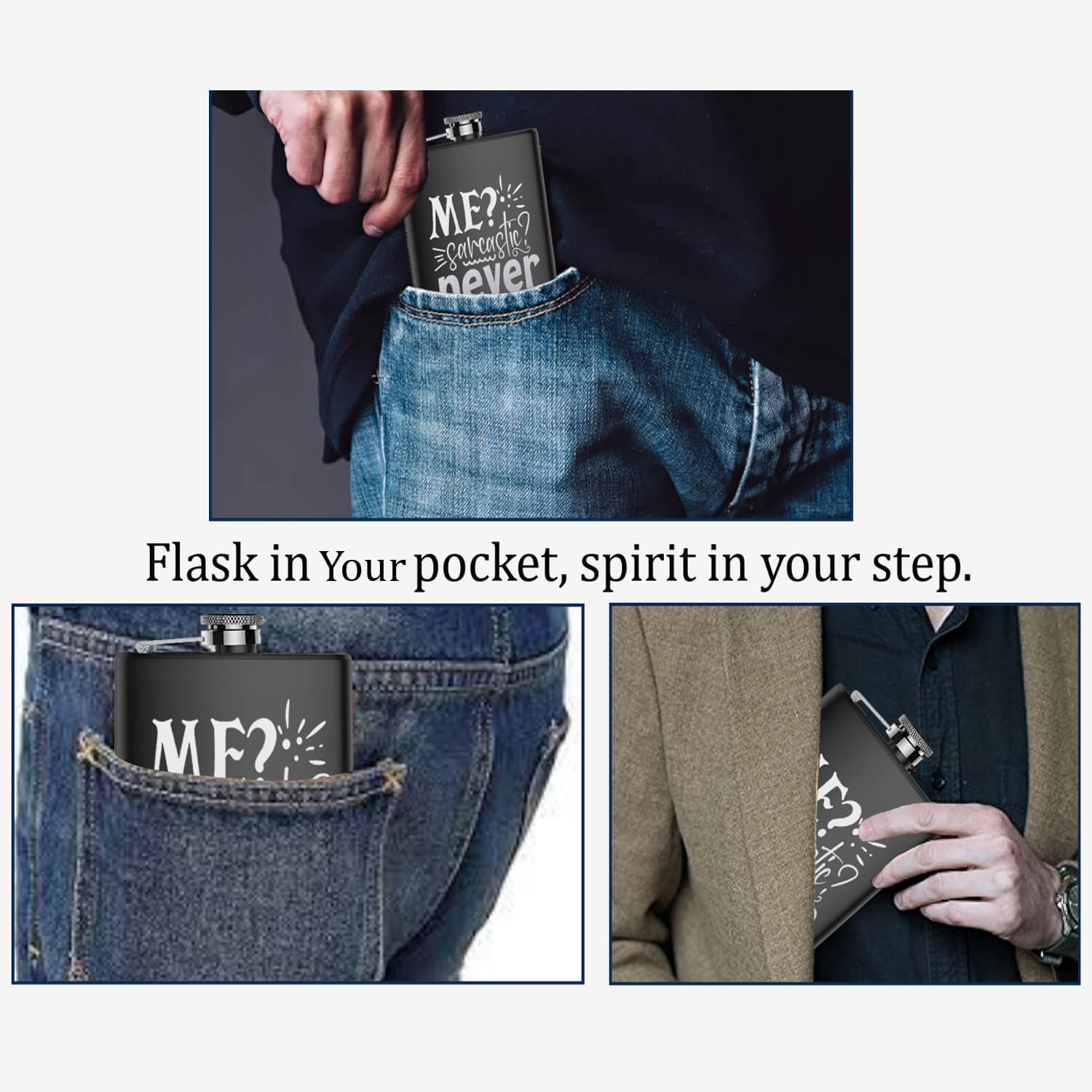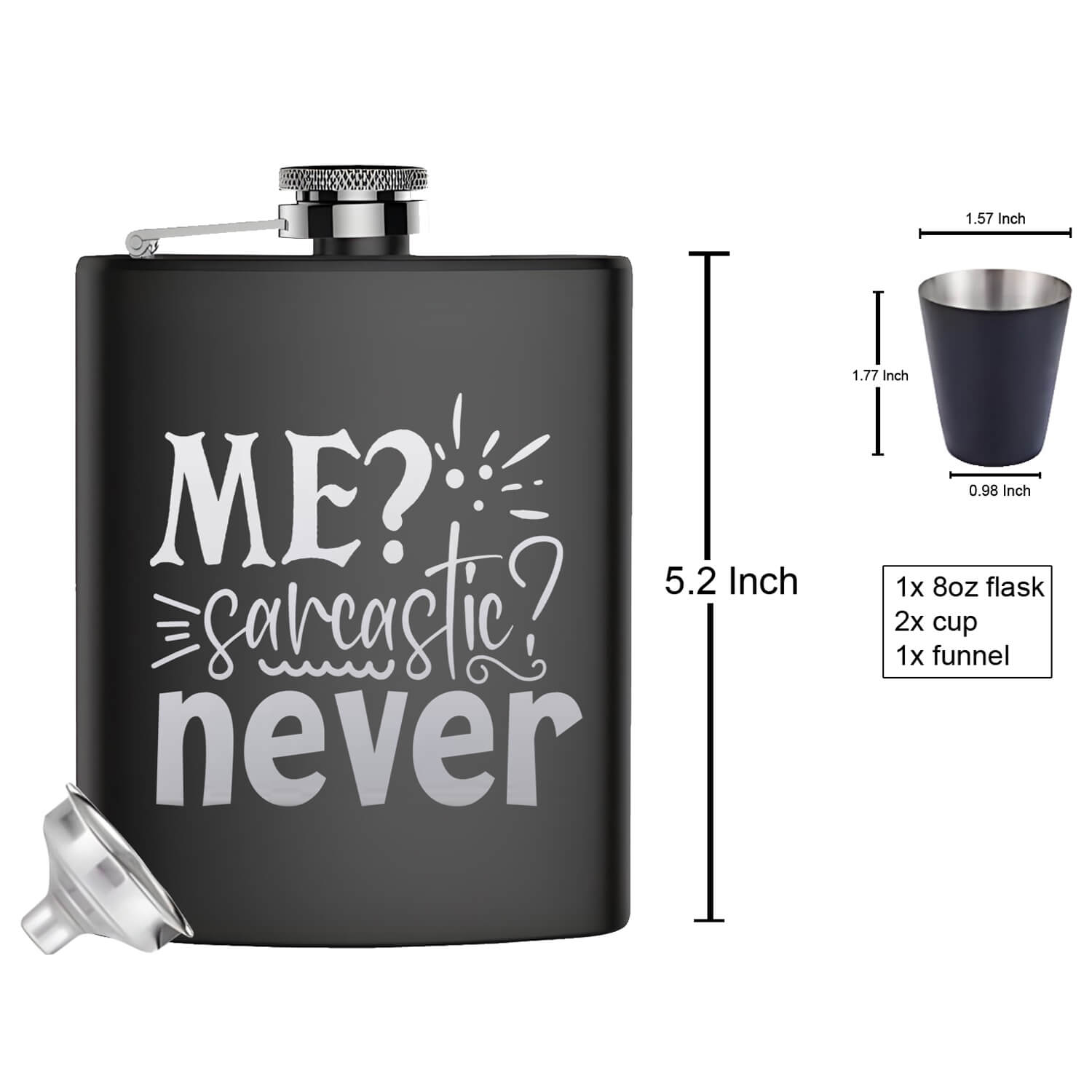 Make a statement with your gift-giving with our Premium Engraved Steel Hip Flask: Me Sarcastic Never. Whether you’re marking a birthday, anniversary, or any special occasion, this flask is guaranteed to impress with its blend of humor and craftsmanship. Shop now and add a touch of wit to your gifting!