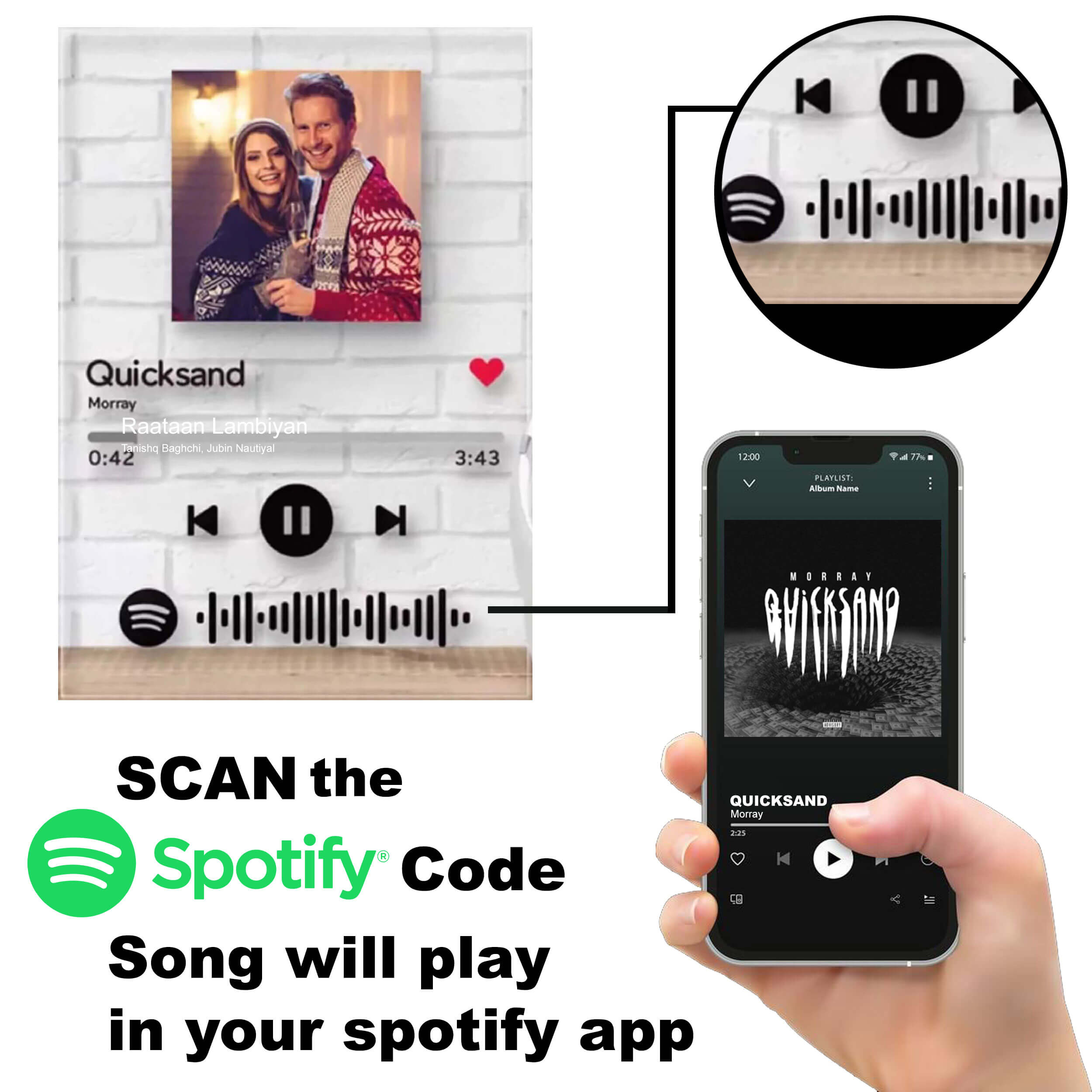 Acrylic Spotify Frame is the new trend of picture frame, the newest and high quality picture frame in the market. The unique design and concept is a gorgeous Personalized Photo Frame with your own engraved text and photo with Spotify song code. This photo frame with rod will make a great bonding gifts for couples, friends, anniversary, birthday photo frames, customized gifts for women and more. You can send us a song link and add a photo that will engrave on it. We offer lifetime engraving on our photo frames. This photo frame is proudly made in India.