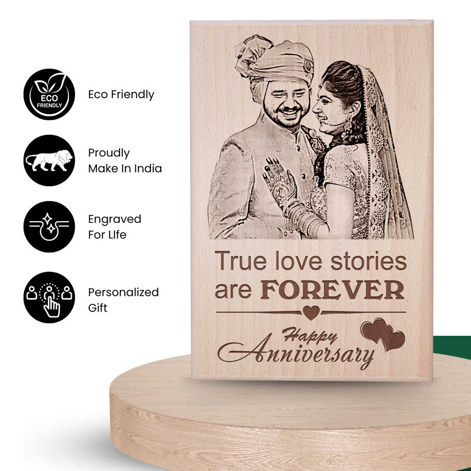 The frame can be personalized with the couple’s picture and a hertfelt messege, turning it into personalized anniversary gifts for couples that speak volumes. The engraving is done with precision, adding a touch of elegance and sophistication. This happy anniversary picture frame is a wonderful way to say “I love you” and “Congratulations.” Whether displayed on a a bedside table, or a wall, this anniversary wooden frame is designed to draw attention and admiration. Its versatility makes it not just a wedding anniversary gift but also a perfect addition to any special occasion celebration. Personalized photo gifts like this frame are a thoughtful way to celebrate milestones.