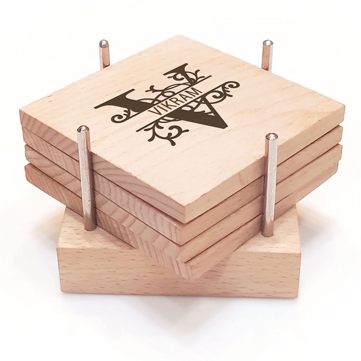 Personalized Engraved Name Wooden Tea Cup Coasters Set of 4 Gift Item for Dining Table with Stand