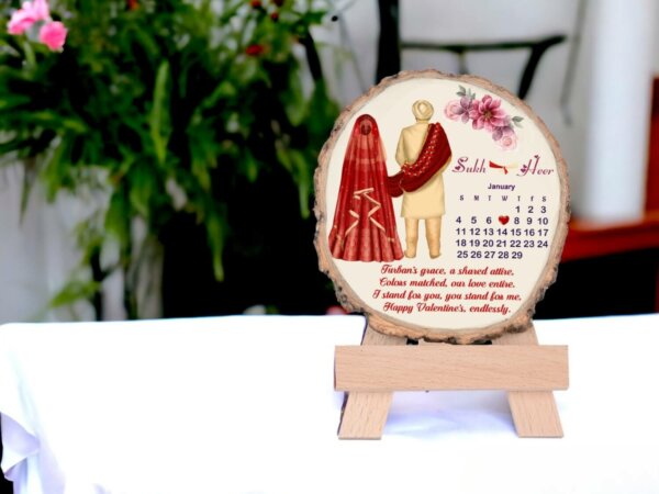 This frame serves as a wonderful decor piece for your living room or bedroom, constantly reminding you of the love and bond shared on your special day. Our skilled artisans ensure precise engraving, creating a polished and long-lasting finish. Whether you’re gifting it to your spouse or a special couple in your life, the Personalized Slice Wood Wedding Calendar Couple Frame is a memorable keepsake that will be cherished for years to come.