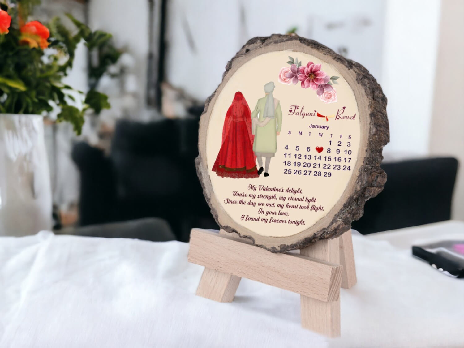 This frame serves as a wonderful decor piece for your living room or bedroom, constantly reminding you of the love and bond shared on your special day. Our skilled artisans ensure precise engraving, creating a polished and long-lasting finish. Whether you’re gifting it to your spouse or a special couple in your life, the Personalized Slice Wood Wedding Calendar Couple Frame is a memorable keepsake that will be cherished for years to come.
