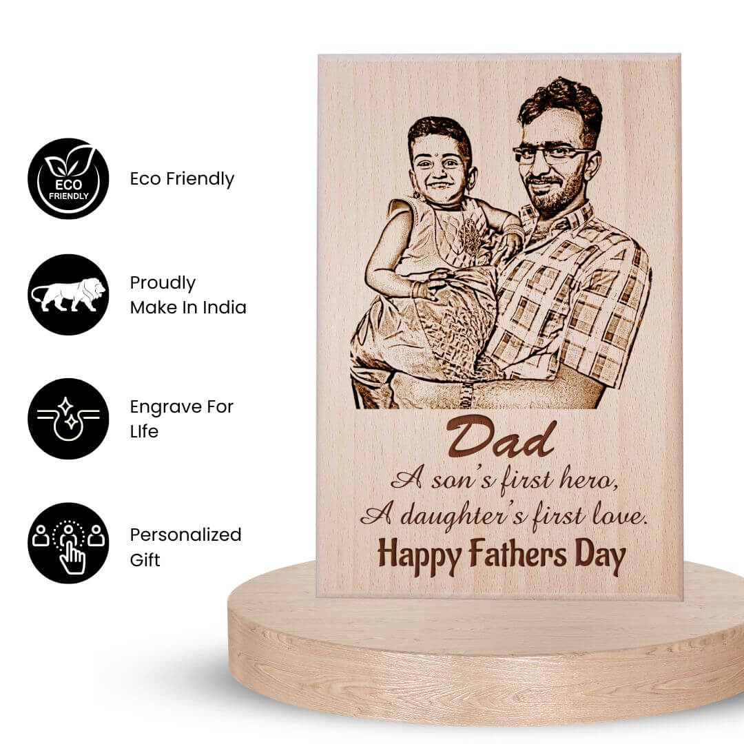 Introducing our timeless Wooden Engraved Photo Frame, the epitome of elegance and sentimentality. Each fathers day frame is meticulously crafted from premium-quality wood, ensuring durability and a touch of natural charm. Ideal for treasuring cherished memories, this personalized frame adds a touch of sophistication to any space. Crafted with precision, our engraved photo frame exudes craftsmanship and attention to detail. The intricate engraving showcases the beauty of craftsmanship, making it the perfect photo frame gift for any occasion, especially Father’s Day.