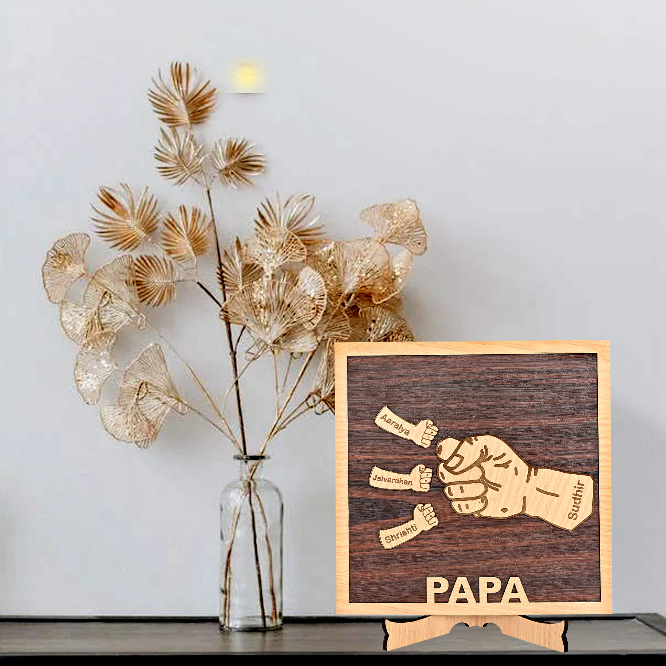 The wooden frame is engraved with your family members with father name, creating a one of the best personalized gifts for men and unique gift that will be cherished for years to come. The frame is available in 9×9 Inches and can be put on the table, making it a perfect addition to any home decor.