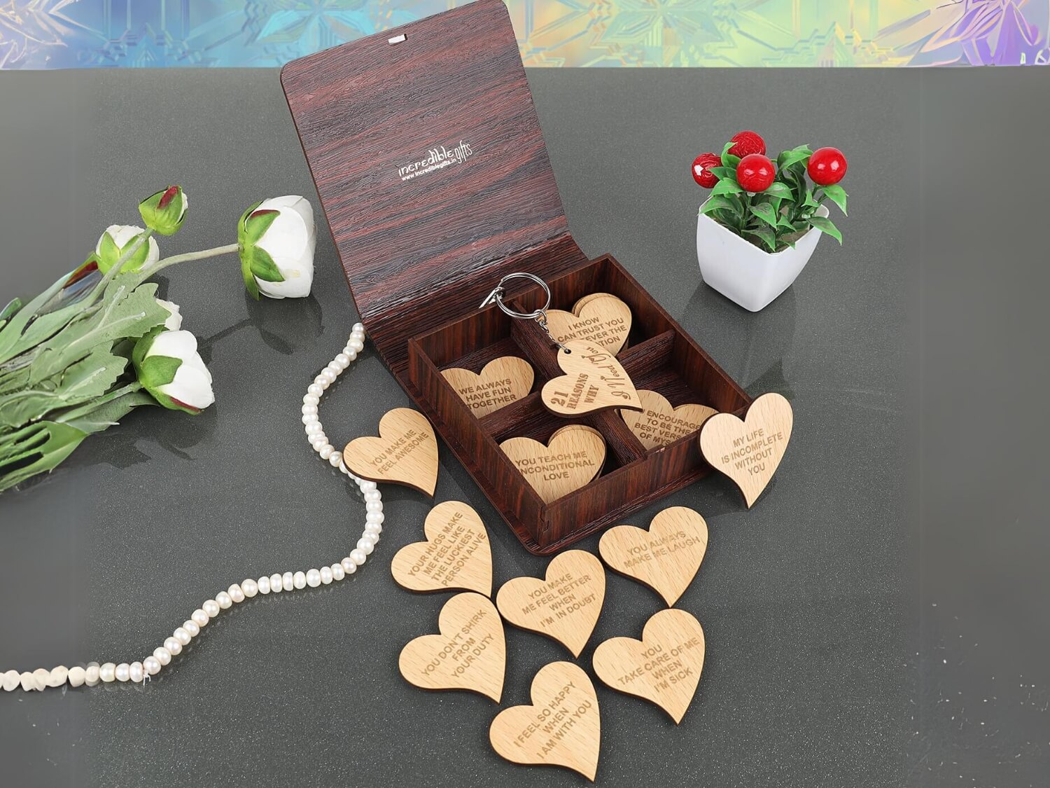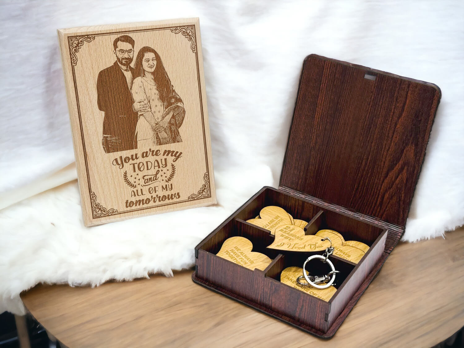 This unique gift combo for couples features a beautifully crafted wooden photo frame paired with a ’21 Reasons Why I Need You’ box.