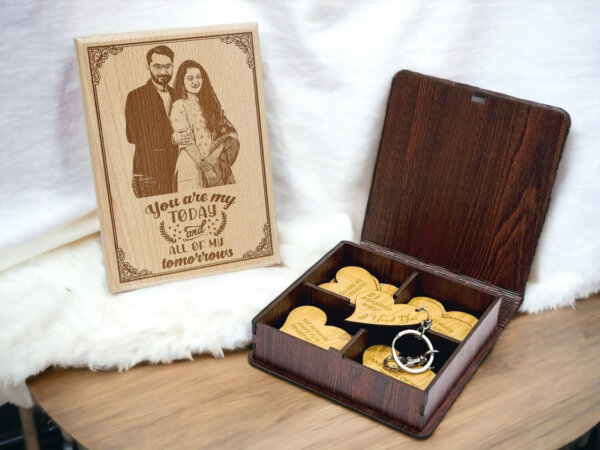 The centerpiece of this combo is the beautifully engraved wooden photo frame, meticulously crafted to hold your cherished memories. Personalize it with your names, anniversary date, or a special message to make it truly one-of-a-kind. Whether it’s a romantic getaway, a candid moment, or a milestone celebration, this photo frame is the perfect canvas to display your love.