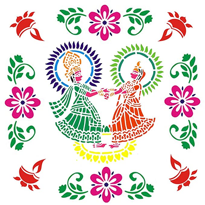 RadhaKrishna Rangoli with Floral Stencil Combo with 6 Colors