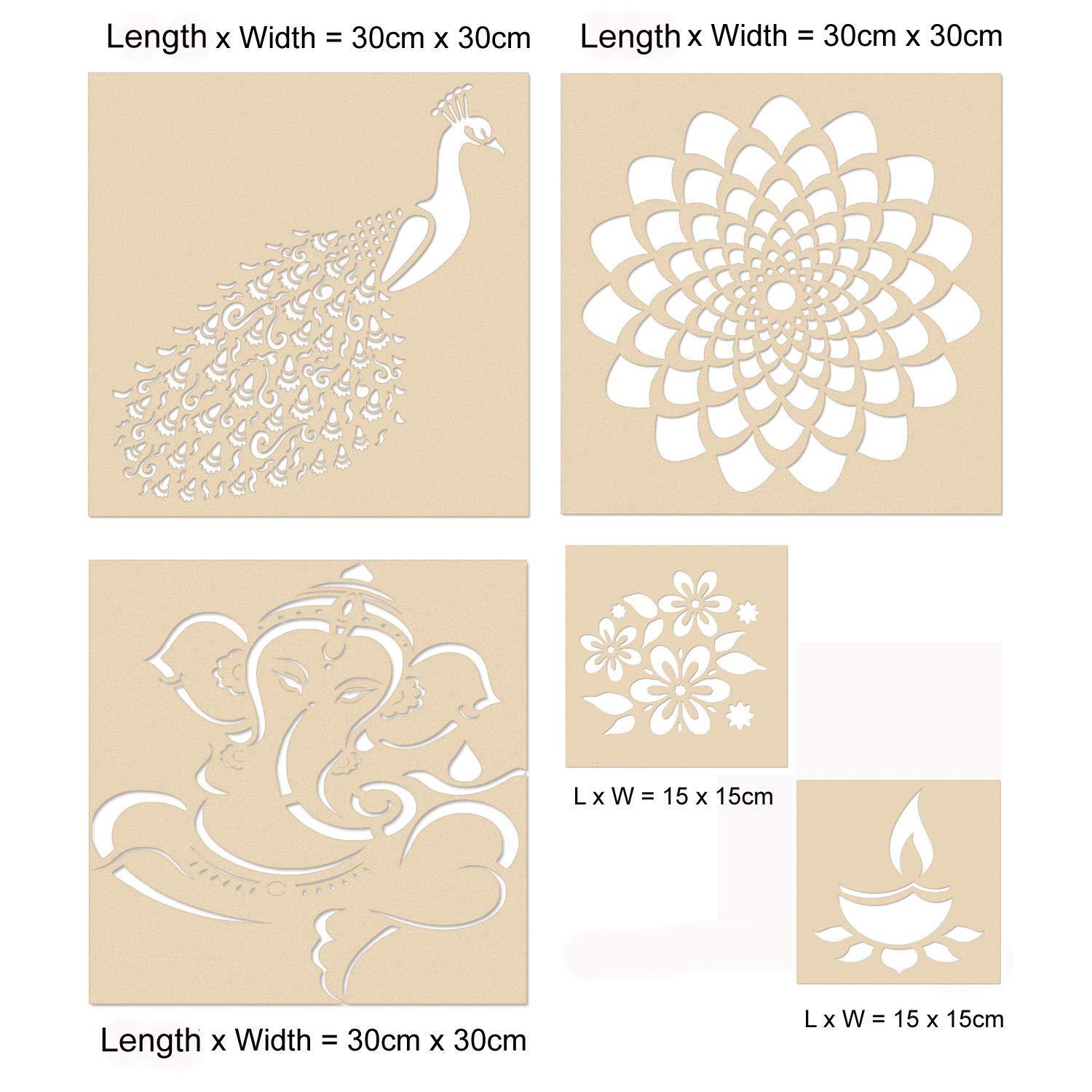 - Size: Set of 5 Rangoli Stencils with 3 Stencils of 30cmx30cm and 2 Stencil is of 15cmx15cm with colours
