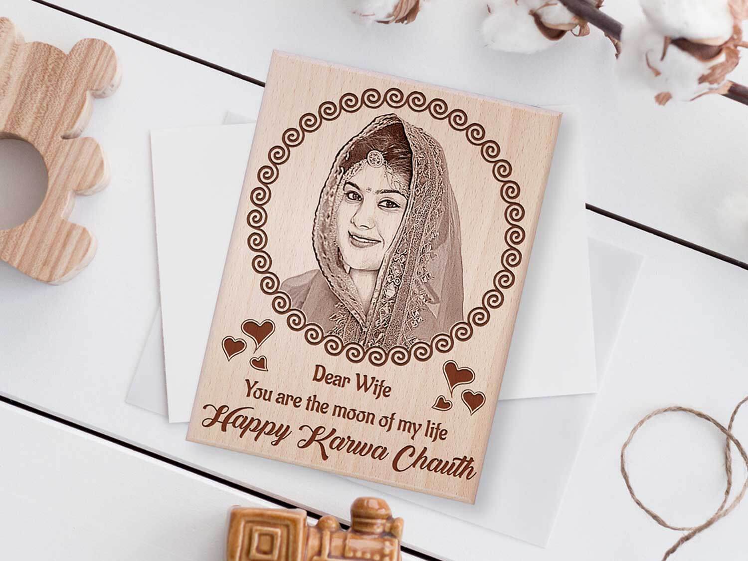 Personalized Engraved Wooden Photo Frame Karwachauth Gift For Wife