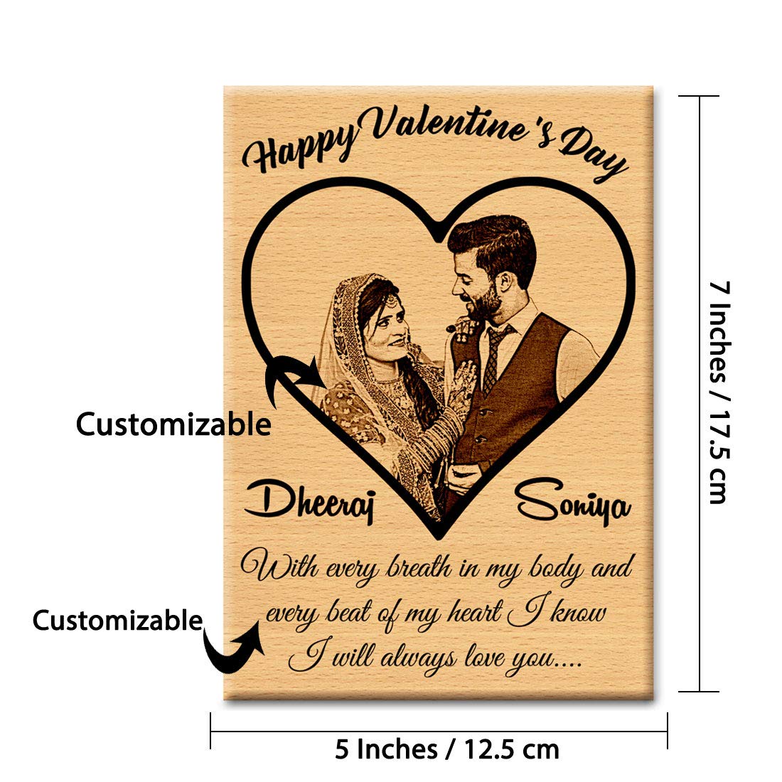 - SIZE & MATERIAL – Personalized Engraved Photo Frame is made of real wood and Heart Box is Metal with Flowers are made of Polyster Fabric. Size of the Wooden Frame is 7×5 inches and Heart Box Size is 5×4.5 Inches