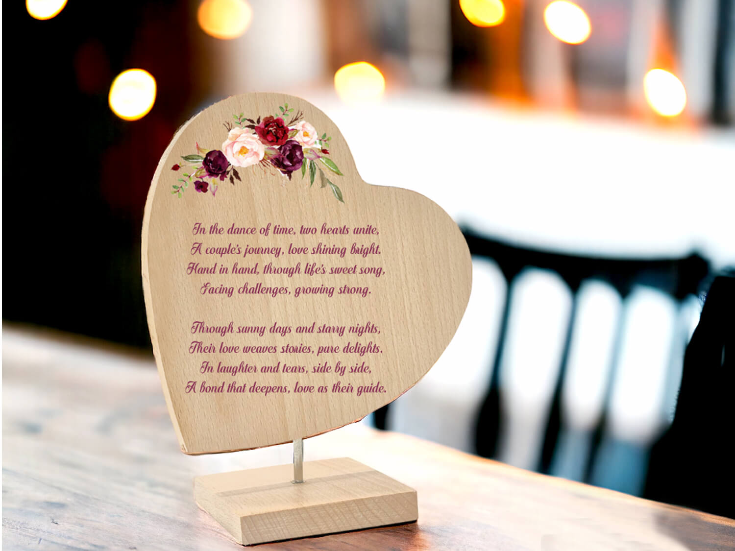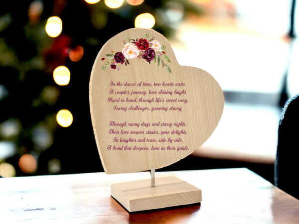 Crafted from high-quality wood, this photo frame exudes warmth and elegance. Its unique double-sided design allows you to showcase two special moments with personalized Poem or Message, making it a symbol of your enduring love and connection. The heart-shaped frame adds a touch of romance, making it an ideal choice for couples looking to immortalize their cherished memories.
