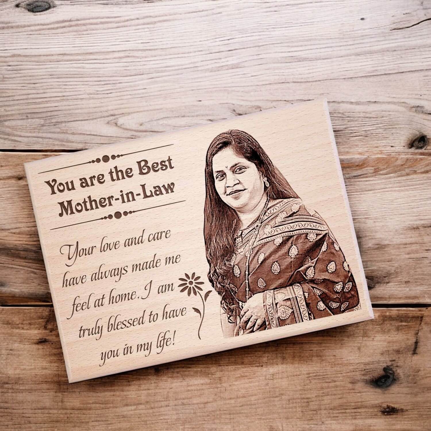 Surprise your mother-in-law with a beautifully engraved wooden photo frame, a meaningful gift for mother-in-law that captures precious memories. Perfect as a mother-in-law photo frame, this elegant keepsake makes an ideal mother-in-law birthday gift, Mother’s Day gift, or a special token of love.