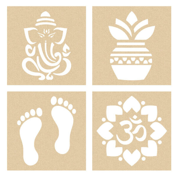 The set includes four unique stencil designs (Laxmi Charan, Kalash, Ganesha & Om) that can be used with the included rangoli colors to make vibrant, intricate patterns. These wooden stencils for rangoli are lightweight, eco-friendly, and reusable, making them an excellent choice for environmentally-conscious buyers. Whether you’re new to creating rangoli or a seasoned artist, this set provides a perfect blend of tradition and modernity.